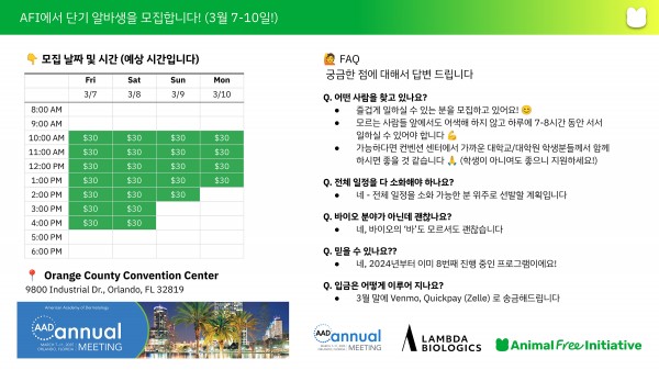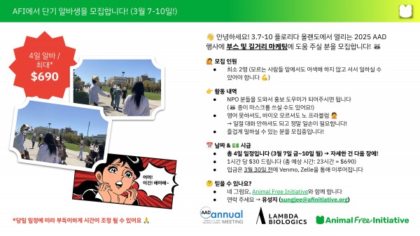 3월 7일 - 10일 (총 4일) 플로리다 올랜도에서 열리는 2025 AAD (American Academy of Dermatology) Annual Meeting 에서 부스 및 길거리 마케팅에 도움 실 분을 모집합니다!