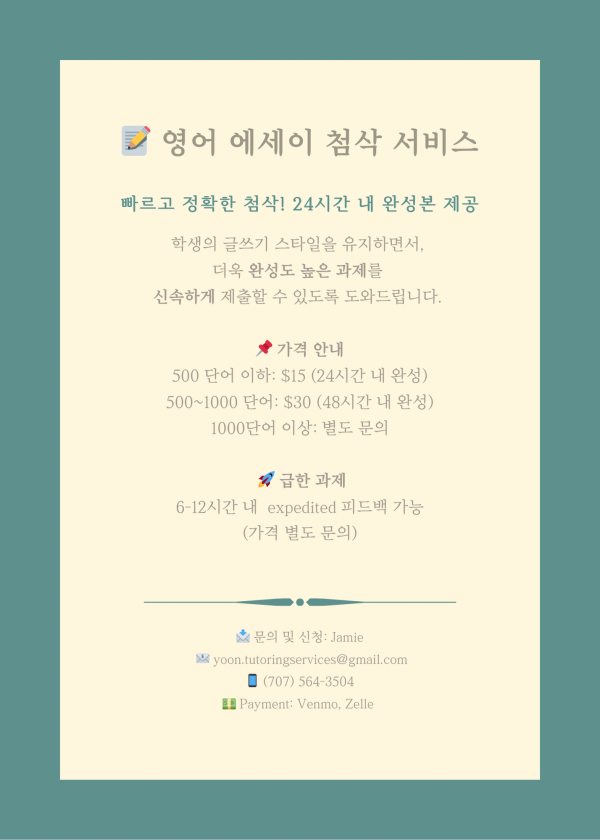 중고등학생 GPA 관리를 위한 영어 글쓰기 첨삭 서비스를 제공합니다.