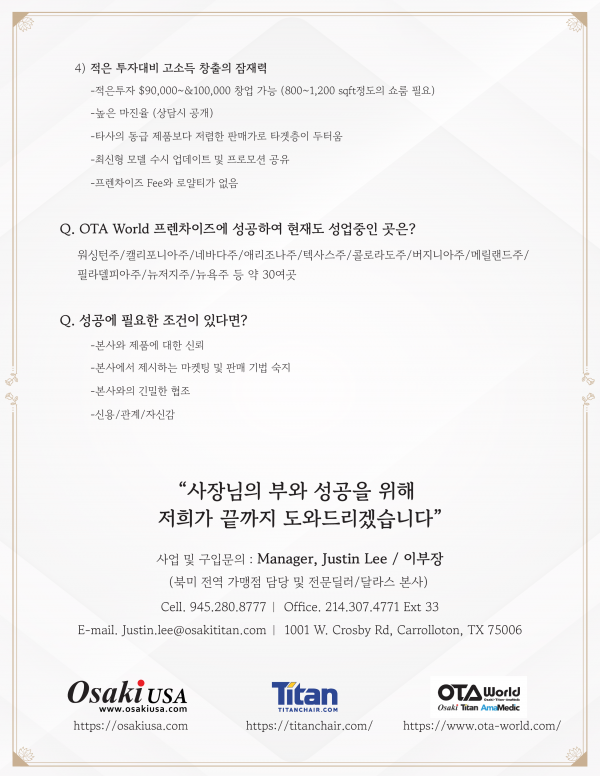 궁금하신 점 언제든지 이메일 혹은 945.280.8777(cell)/214.307.4771 EXT.33(office)로 문의주시기 바라며, 혹시 전화연결이 안되면 문자로 프랜차이즈에 관심있다고 메세지 보내주시면 바로 연락드리겠습니다.