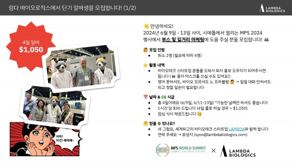 영어 못하셔도, 바이오 모르셔도 노 프라블럼 → 일절 대화 안하셔도 되고 정말 일손이 필요합니다