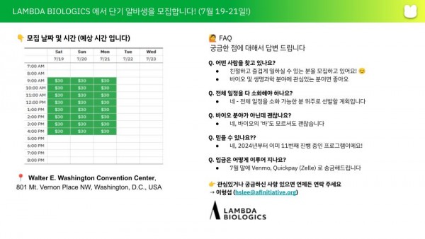 7월 19일 - 21일 (총 3일) Walter E. Washington Convention Center, 801 Mt. Vernon Place NW, Washington, D.C., USA 에서 열리는 2025 AVMA (American Veterinary Medical Association) 에서 부스 운영에 도움 실 분을 모집합니다!