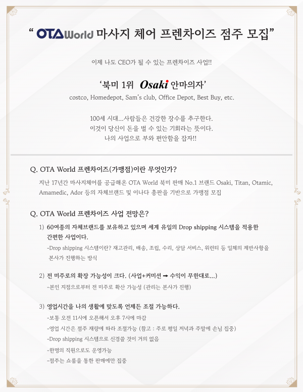 저희는 지난 17년 동안 북미지역에 자사 브랜드 Osaki를 포함한 60여종의 안마의자를 Drop Shipping 방식(재고, 배송, 서비스 및 일체의 제반사항은 본사가 진행하는 시스템)으로 전미주에 공급해오고 있는 회사입니다.