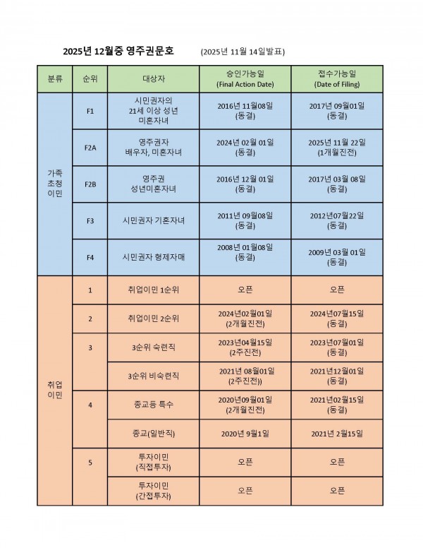 미국 국무부(DOS)는 10월 14일 2025년 12월중 영주권문호(Visa Bulletin)를 발표했습니다. 12월 영주권문호에서는 가족이민의경우 영주권자배우자와 미성년자녀인 F2A만 2개월진전되고 나머지는 모두 동결되었으며, 취업이민은 승인가능일에서 2순위가 2개월 진전되고 3순위가 2주 진전 되었습니다.