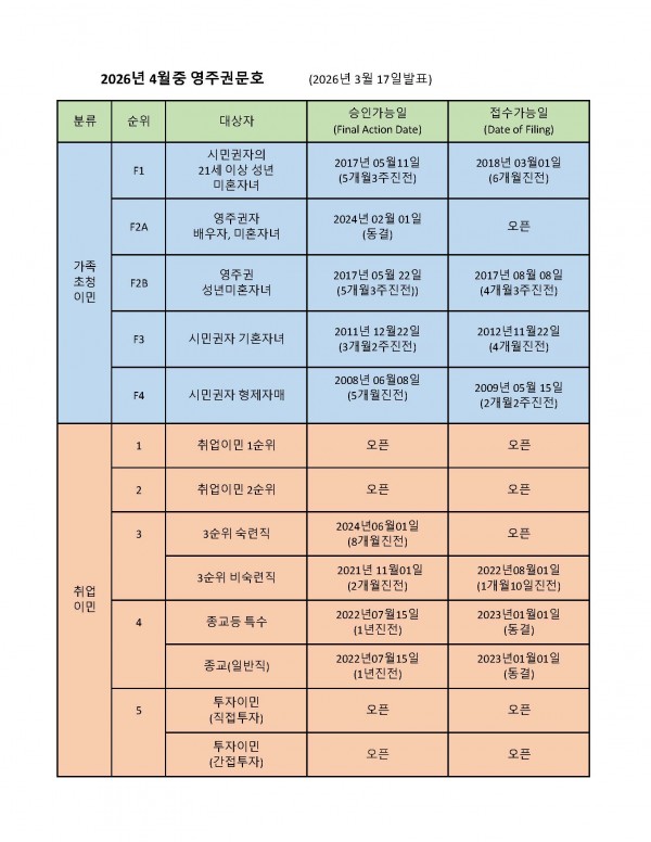 미국 국무부(DOS)는 3월 17일 2026년 4월중 영주권문호(Visa Bulletin)를 발표했습니다. 4월 영주권문호에서는 취업이민 3순위 숙련직과 전문직의 영주권 접수가능일(Filing Date)이 오픈되는등 큰폭의 크게 진전이 되었습니다. 가족이민의경우도 승인가능일(Final Action Date) 과 접수가능일(Filing Date)이 크게 진전되었습니다.