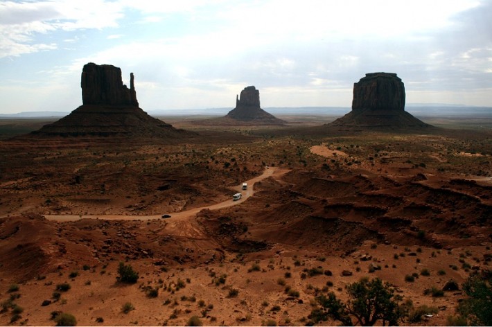 모뉴먼트 밸리의 진수를 보여 주는 풍경이다. 미튼 바위(Mittens Butte. 맨오른쪽)와 동서 매릭 바위(Merrick Butte), 그리고 공원을 고리 모양으로 이어주는 황량한 비포장도로가 모뉴먼트 밸리의 전형적인 모습이다.
