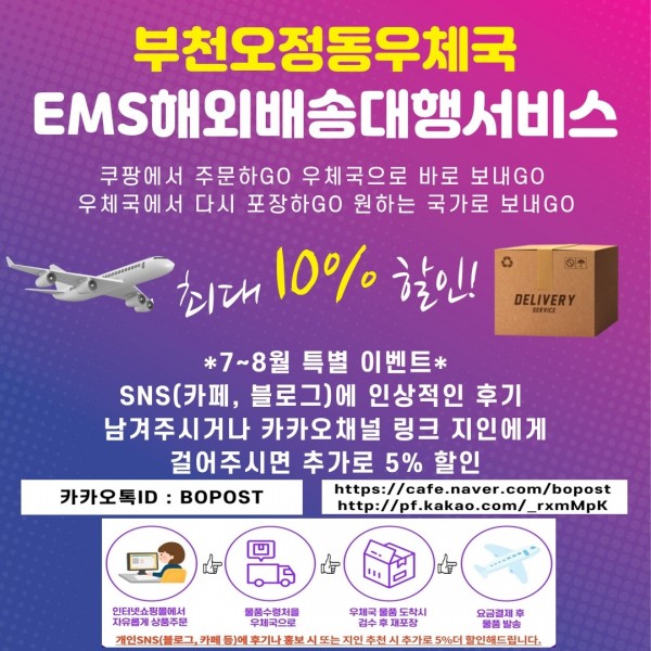 EMS해외배송대행서비스 요금 최대 10% 할인!!! "부천오정동우체국" 7~8월 할인 이벤트~!!!