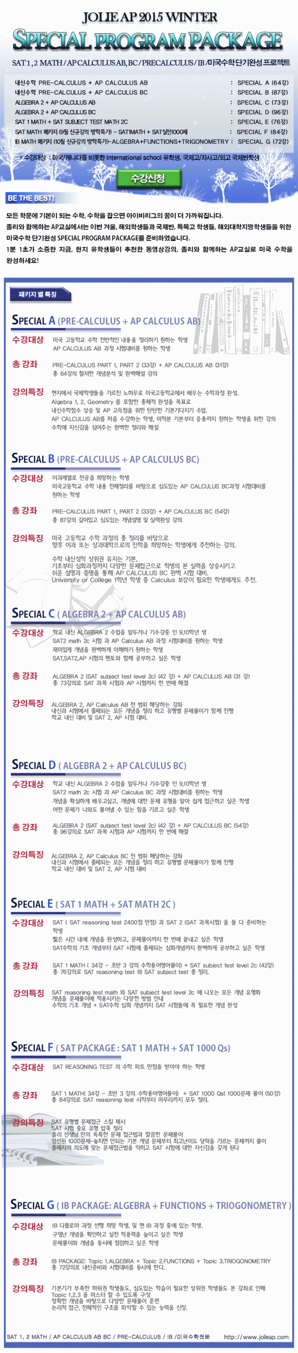 유학생 전문 수학 강의 [졸리와함께하는AP교실]에서는 ' 학원보다 좋은 동영상강의' 로 이번 겨울, 해외 학생들과 국제반,특목고, 재외국민 전형 및 해외대학지망 학생들을 위한 영미권 수학 단기완성 special program package 를 준비하였습니다. 12월을 시작으로 겨울방학 동안 SAT1,SAT2, 내신 수학과 AP , IB 대비 까지 , 유학생이 추천하는 강의로 방학동안 수학을 완성하십시오.