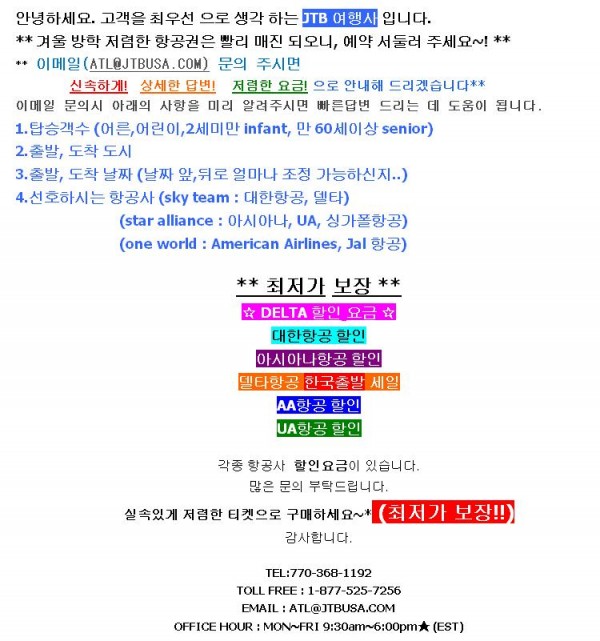 [JTB 여행사] 겨울 항공권 SALE!! (ATL@JTBUSA.COM/1-770-368-1192) 페이지 정보 작성자 JTB여행사 작성일13-09-06 04:30 댓글0건 조회3,969회 관련링크 목록 본문 [JTB 여행사] 겨울 항공권 SALE!! (ATL@JTBUSA.COM/1-770-368-1192) 댓글목록 등록된 댓글이 없습니다. 로그인을 해야만 댓글을 작성할 수 있습니다. 목록