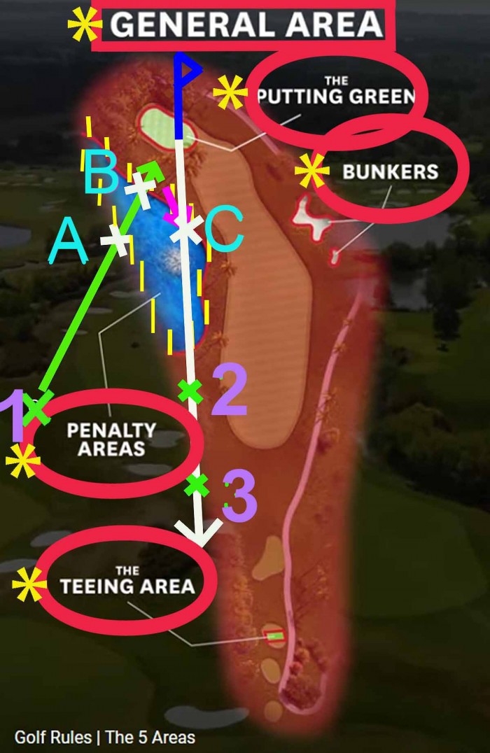 그림에서처럼 1 번 지점에서 공을 쳤는데 공이 물을 건너서 그린 앞 땅을 맞고 굴러서 C 지점을 통해서