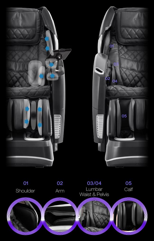 에어백은 어깨, 팔, 허리, 골반, 종아리 부위에 있습니다. 이 압축 마사지는 몸 전체의 혈액 순환을 지속적으로 증가시켜 통증과 긴장을 완화하는 데 도움이 됩니다.