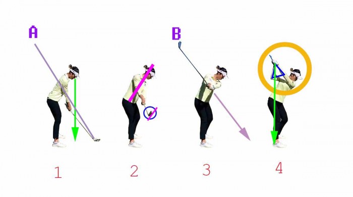 -이 시점에서 척추 각도와 클럽의 리딩엣지 각도가 거의 평행선을 이루었습니다.(분홍색 선)