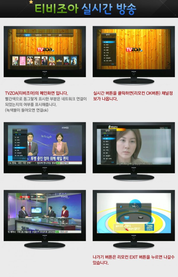 티비조아(TVZOA)는 언제 어디서나 인터넷만 가능하면 TV로 즐길수 있는 고품격 영상 서비스를 제공하며 실시간 한국방송은 물론 최신영화 , 드라마 , 예능 , 교육 , 스포츠 등 다양한 프로그램들을 마음껏 즐길수 있는 제품입니다.