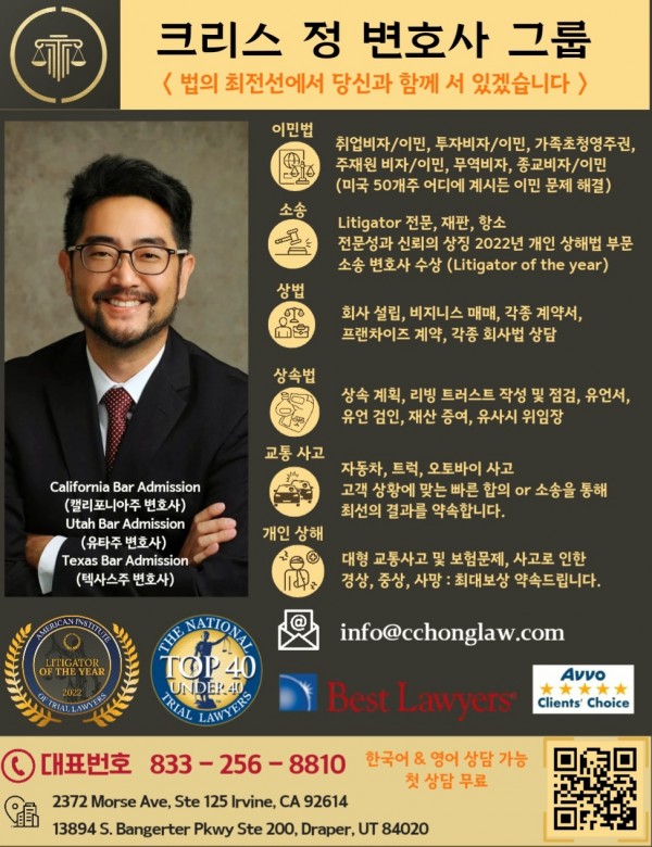 상법, 상속법, 교통사고, 개인 상해, 소송전문 : 텍사스, 유타, 캘리포니아에서만 제공하는 전문 법률 서비스, 해당 주의 법률에 대한 깊은 이해와 경험을 바탕으로, 고객님께 최상의 법적 해결책을 제공합니다. 세 주의 엄격한 변호사 자격 요건을 충족한 크리스 정 변호사는, 해당 주에서만 제공할 수 있는 깊이 있는 법률 서비스를 자랑합니다. 세개의 주 각각에 맞는 전문 법률에 대한 깊은 이해와 경험을 바탕으로, 고객님께 최적의 해결책을 모색해드립니다.